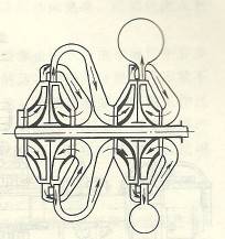 分段式多級離心泵工作原理:分段式多級離心泵中段每個(gè)葉輪的外面均安裝有一個(gè)導(dǎo)輪,導(dǎo)輪是一個(gè)固定不動(dòng)的圓盤,它的作用是把從葉輪甩出的液體的一部分動(dòng)能通過減速而轉(zhuǎn)化為靜壓能,并且把這些液體收集后沿徑向回流而導(dǎo)人到下一級葉輪人口處。尋輪的正面有環(huán)繞在葉輪外緣的正向?qū)~.背面有將液體引向下一級葉輪人口的反向?qū)~,其結(jié)構(gòu)如圖6所示。