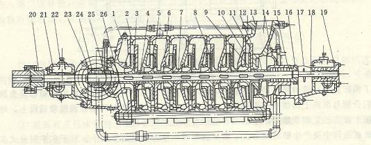 1一進(jìn)水段,2中段 3-升輪;4軸, 5- 導(dǎo)輪;6-承磨環(huán);7-葉輪擋套;8-導(dǎo)葉套;9-平衡盤;10-平衡套;11-平衡環(huán);12-出水段導(dǎo)輪;13-出水段;14-尾蓋;15-軸套乙;16-軸套螺母;17一擋水圉;18-平衡盤指針;19-軸承乙部件;20聯(lián)軸器;2l軸承甲部件;22-油環(huán);23-軸套甲,24~填料壓蓋;25-水封環(huán);26-拉緊螺栓